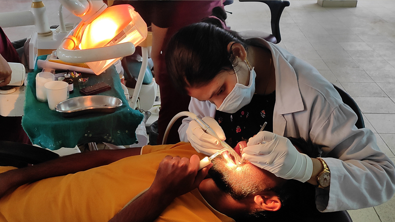 The dental O.P.D. is functioning in the campus with 200 modern state-of-art dental units, an X-ray, O.P.G facilities, CAD / CAM, Intra Oral Scanner, CBCT, light cure composites, Endodontic Microscope, Conscious Sedation and ultrasonic scaling instruments. Presently it has an input of more than 200 patients everyday and all types of dental treatment is being provided for free to poor patients. At the dental clinic, the emphasis is on providing a sterile and aseptic environment for the patients. With the expertise of qualified staff and the patronage of the local population, the clinical section looks forward to becoming a reputed facility for dental care in the entire Eastern Sector. In an endeavour to improvise and expand the treatment avenues for the patient community, the dental clinics will be equipped with more units. Our moto is to provide quality dental care at a very reasonable cost.